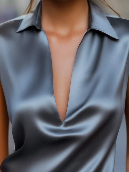 Sleek Gray Satin Plunge Neck Top