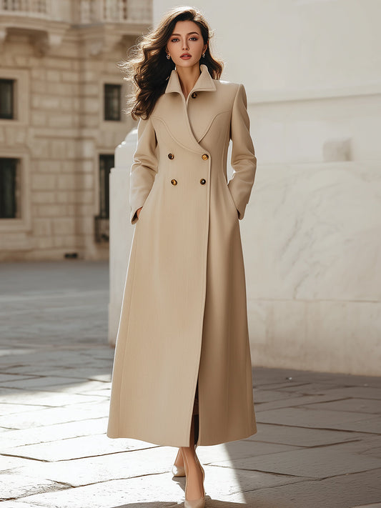 Elegant Double-Breasted Long Wool-blend Coat With Structured Lapels