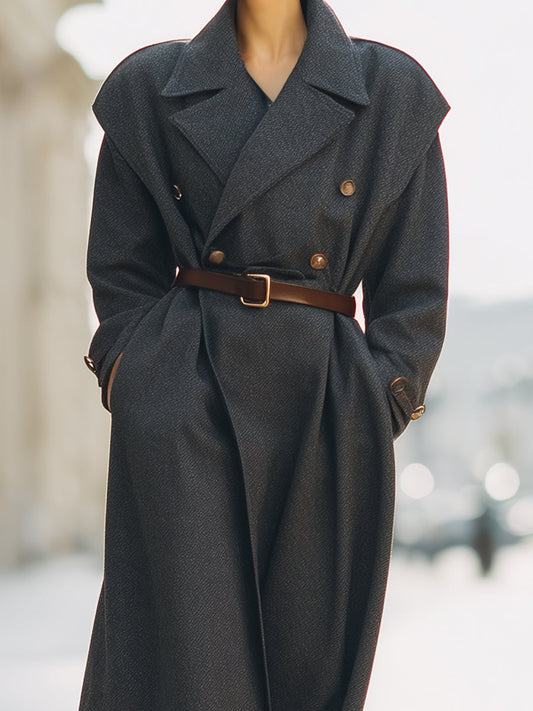 Charcoal Double-Breasted Wool Coat With Belted Waist