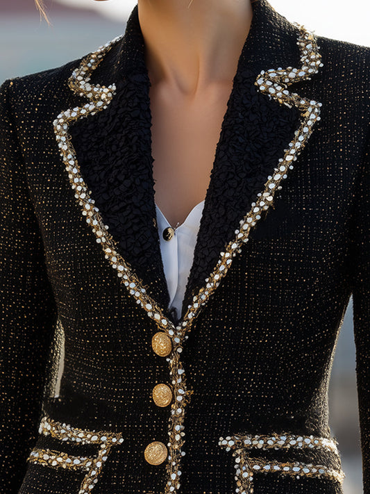 Black Crystal-Trim Tweed Blazer With Gold Buttons