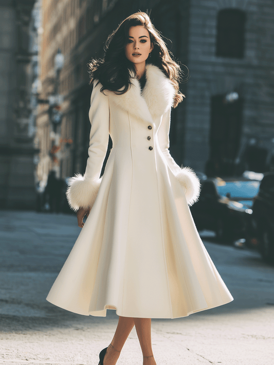 Ivory Flared Coat With Faux Fur Collar And Cuffs
