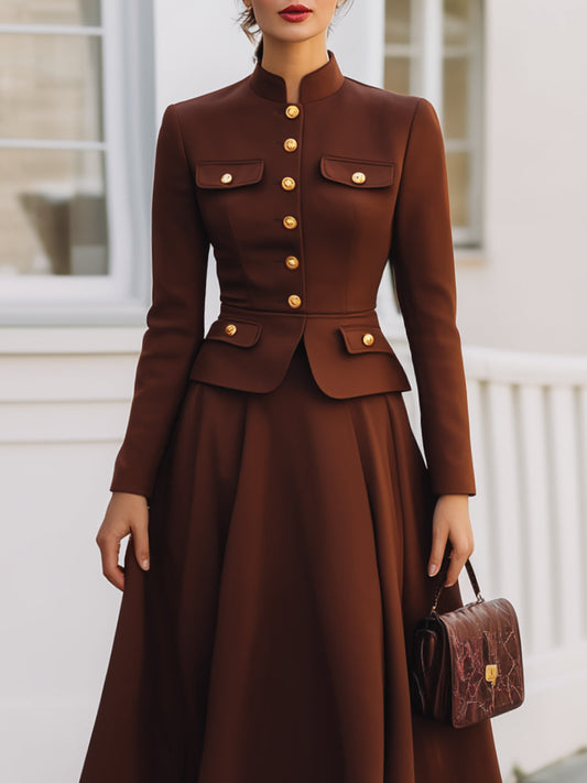Camel Hourglass Blazer Skirt Suit With Gold Buttons