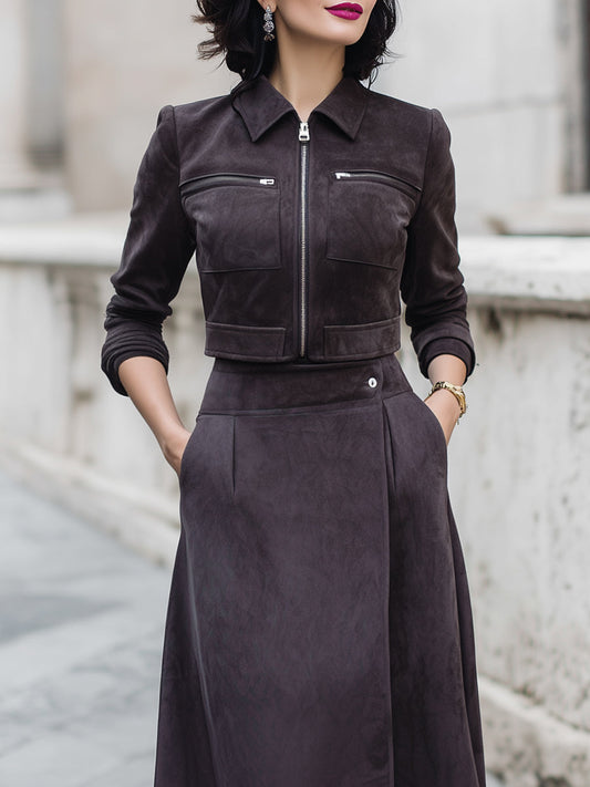 Faux Suede Cropped Jacket And A-Line Midi Skirt Set