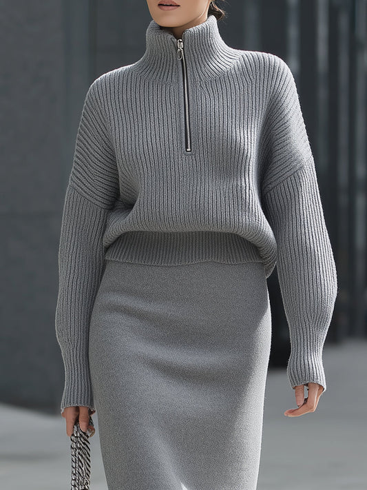 Sophisticated Grey Ribbed Knit Sweater And Midi Skirt Set