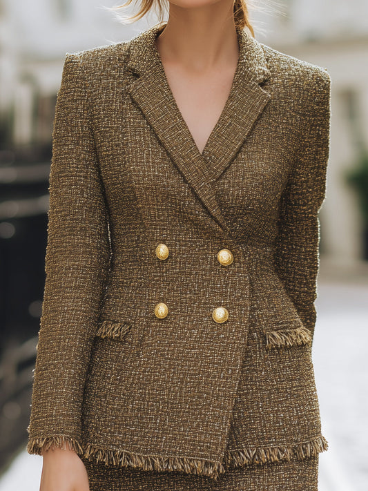 Fringe Trim Double Breasted Tweed Blazer And Skirt Set