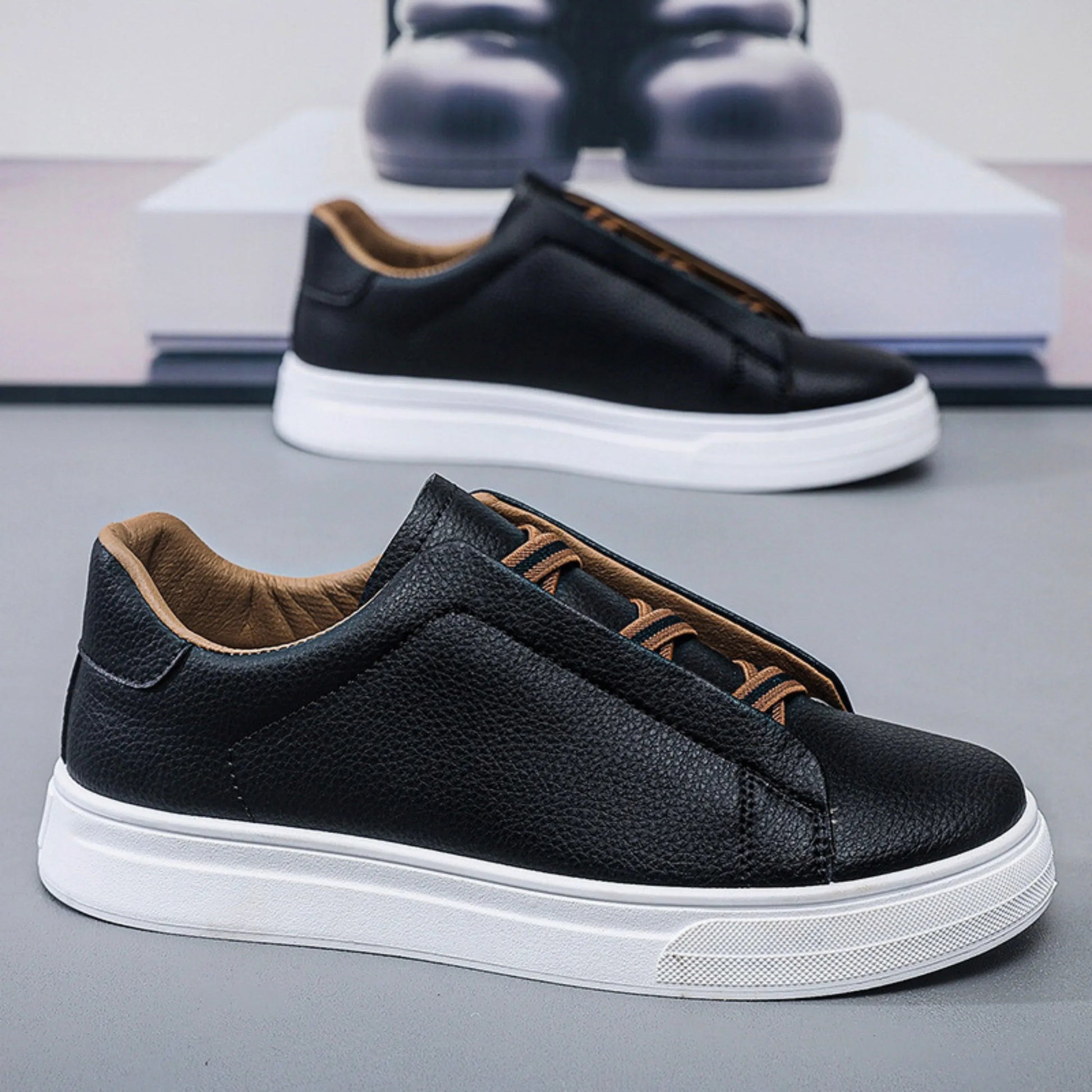 Made from premium leather, the Leo Leather Sneakers offer a sleek and durable feel. They feature a classic slip-on style with a unique lace detail, adding a touch of uniqueness to your footwear collection.
