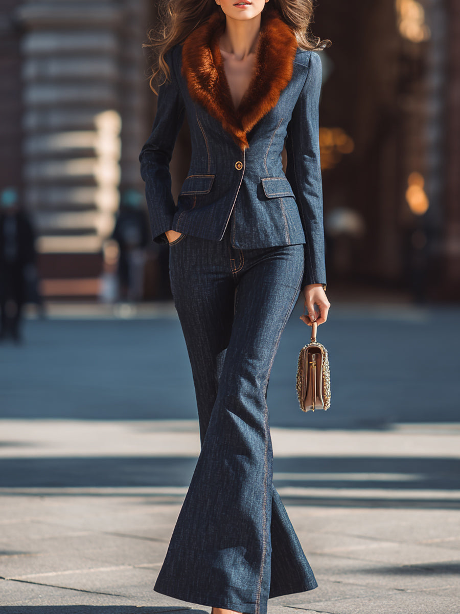 Perfect for fashion - forward office days, brunch dates, or upscale casual events, this suit ensures you look effortlessly stylish and confident. The premium denim offers both durability and a polished appearance, while the fur collar adds a touch of luxury. Style it with heels and a 精致 handbag for a refined, versatile look that transitions seamlessly from day to night.